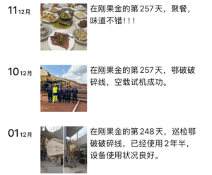 李剑喜欢发朋友圈。随手点开他的动态:“在刚果金的第234天,我司南昌矿机的新颚破破碎站安装中”;“在刚果金的第257天,巡检颚破破碎线,已经使用2年半,设备使用状况良好”……工作之外,也不乏生活的分享,诸如聚餐、做泡菜等等。